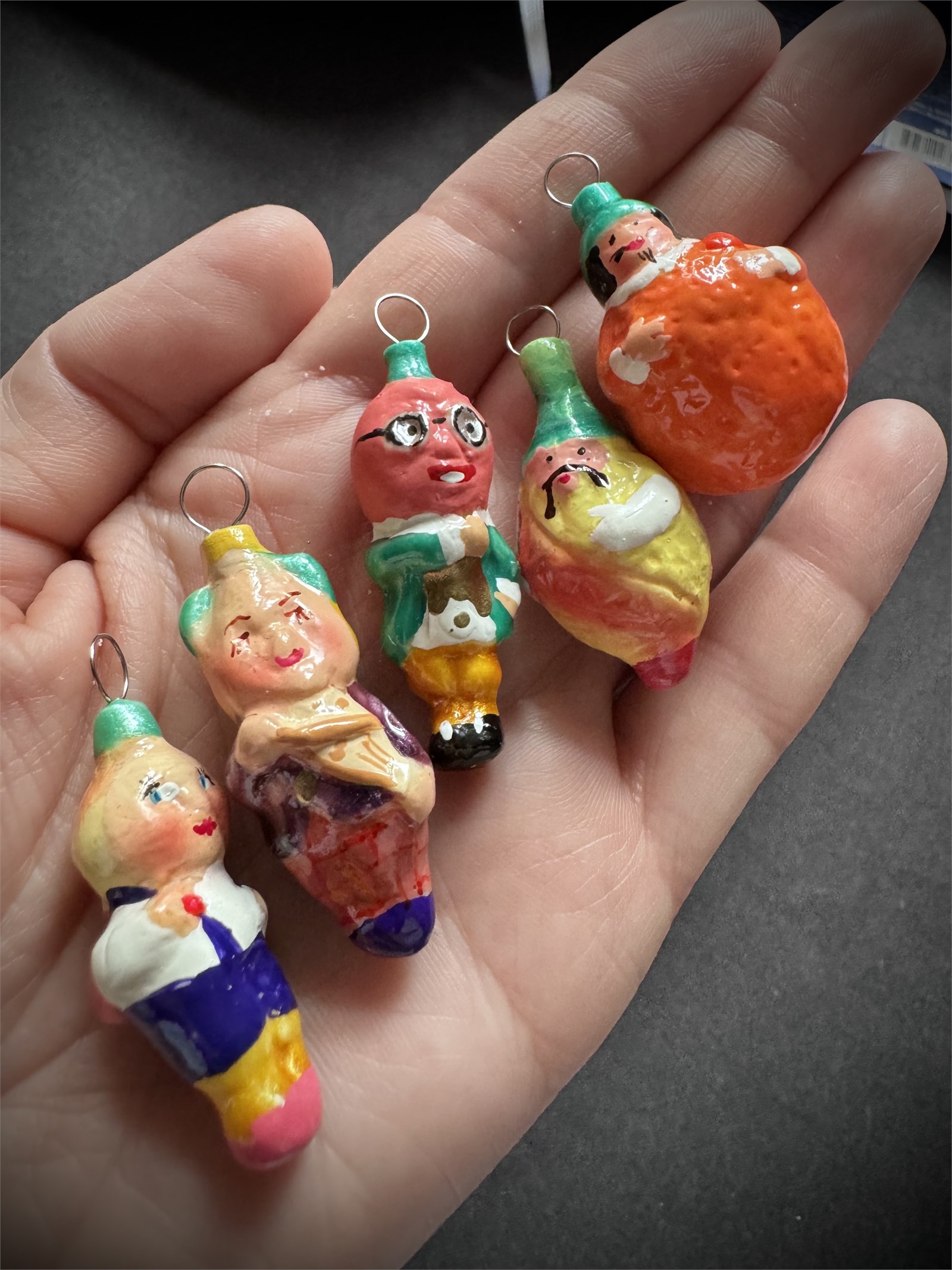 Набор антивандальных елочных игрушек-малюток "Чиполлино", по мотивам одноименной сказки и полноразмерных советских елочных игрушек 50-х годов. Набор включает в себя 5 игрушек: принц Лимон, барон Апельсин, профессор Груша, Чиполлино и сеньор Помидор.