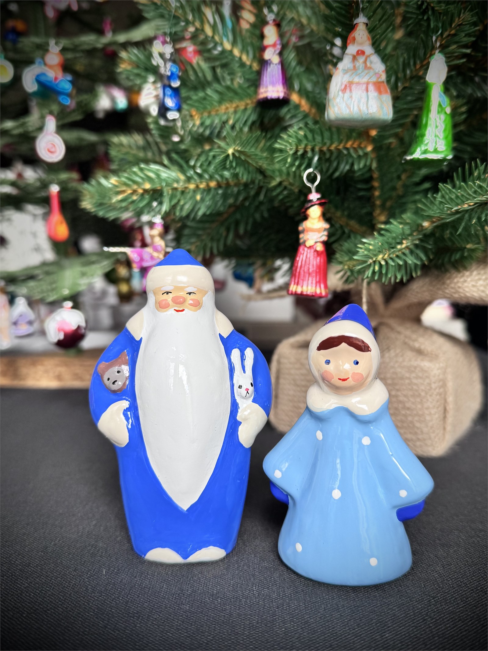Парные подставочные фигуры под елку-малютку - Дед Мороз со Снегурочкой в сине-бело-голубой гамме.