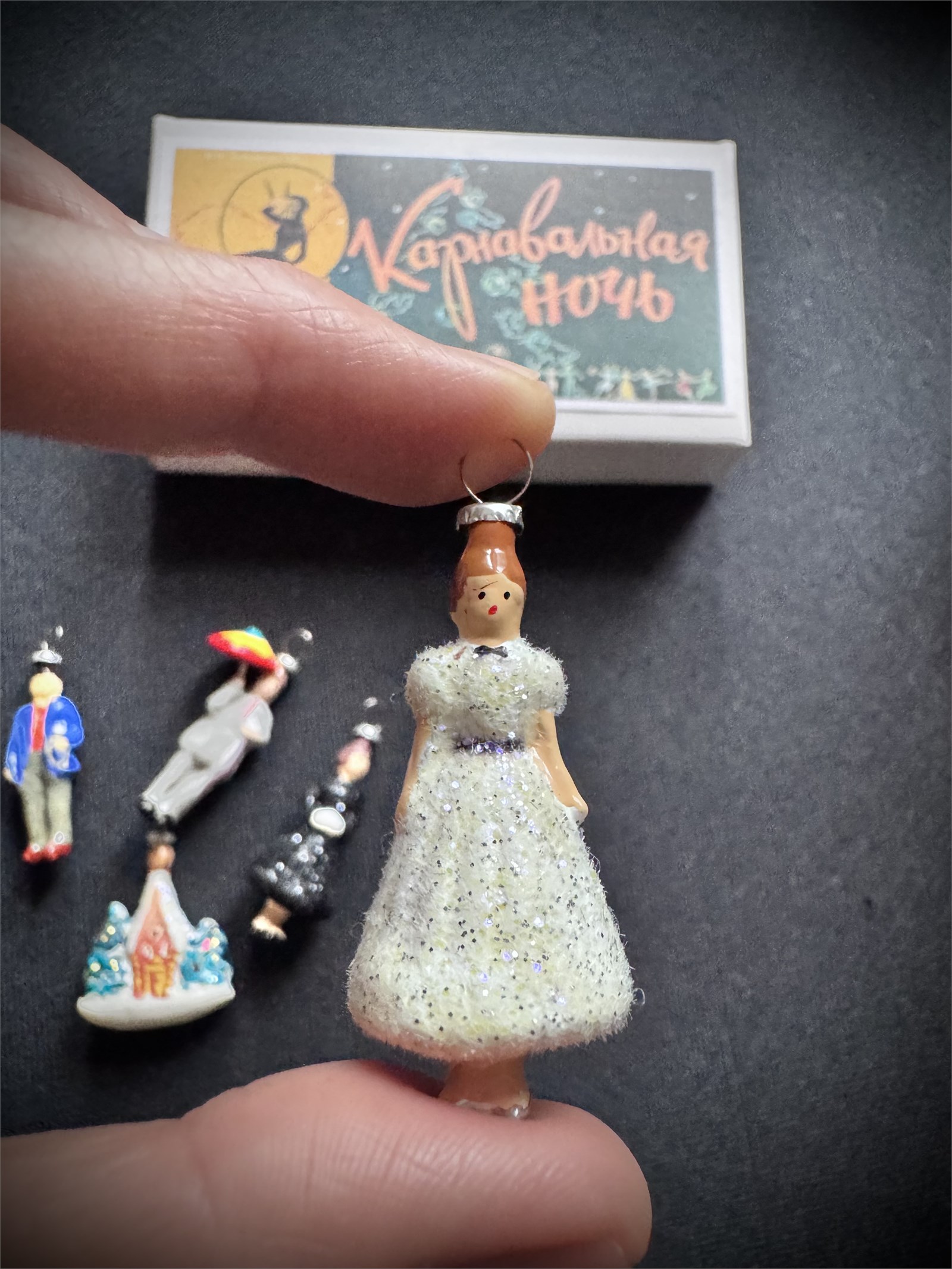 Антивандальная елочная игрушка-малютка из набора, посвященного легендарному новогоднему советскому фильму Эльдара Рязанова "Карнавальная ночь", - Людмила Гурченко в роли Леночки Крыловой в белом платье.