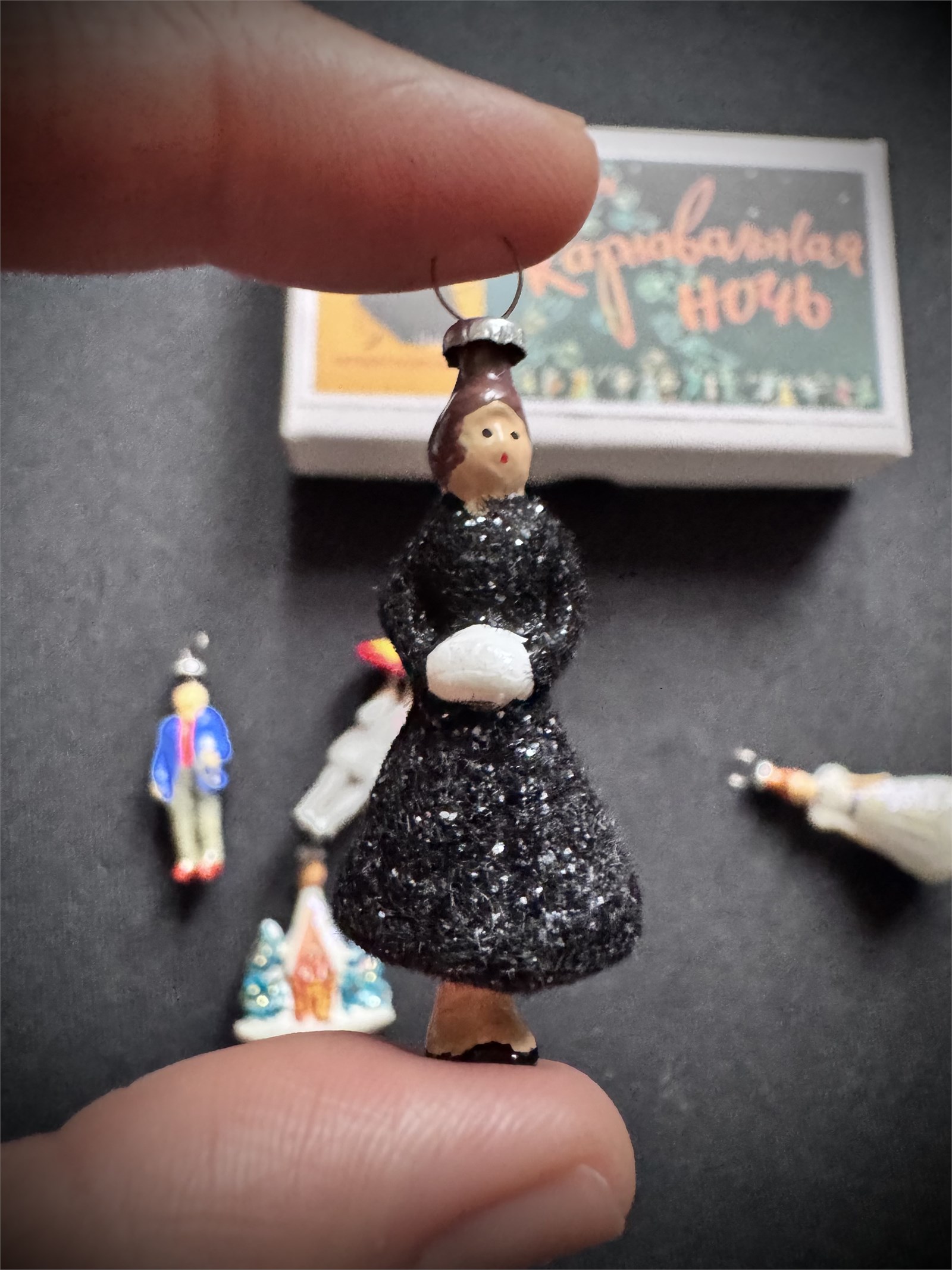 Антивандальная елочная игрушка-малютка из набора, посвященного легендарному новогоднему советскому фильму Эльдара Рязанова "Карнавальная ночь", - Людмила Гурченко в роли Леночки Крыловой в черном платье.